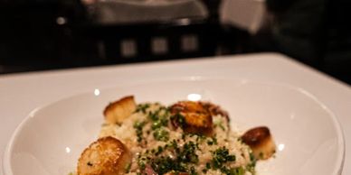 Seared Sea Scallops, Butter Poached Lobster Tail, Savory Puff Pastry, Spaghetti Squash,